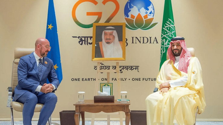 التقى صاحب السمو الملكي الأمير محمد بن سلمان بن عبد العزيز آل سعود، ولي العهد رئيس مجلس الوزراء رئيس وفد المملكة المشارك في قمة قادة دول مجموعة العشرين، في مدينة نيودلهي بجمهورية الهند، اليوم، رئيس المجلس الأوروبي السيد شارل ميشيل.